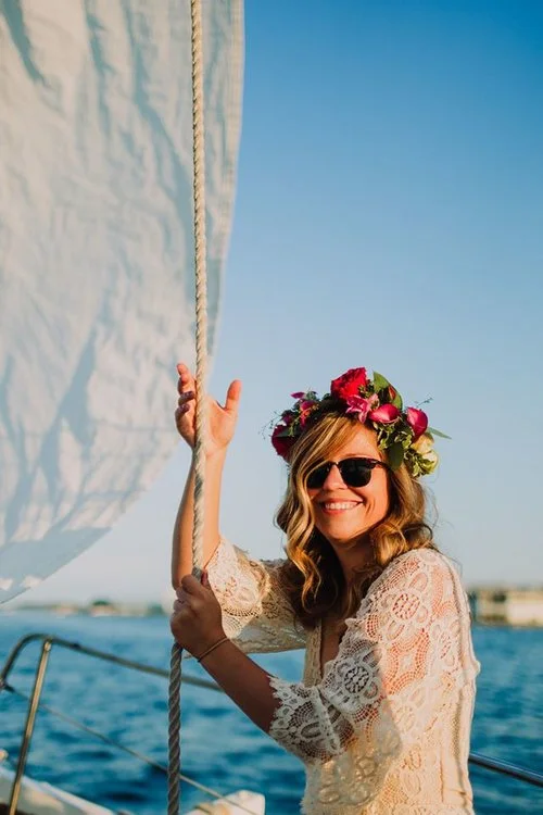 This boho floral crown hangs naturally in the bride's hair. The flowers and greens are strung loosely on a twig base. Bright yellow flowers provide a sweet, flirty pop of color. Pure sunshine! (Angelina Rose Photography)
